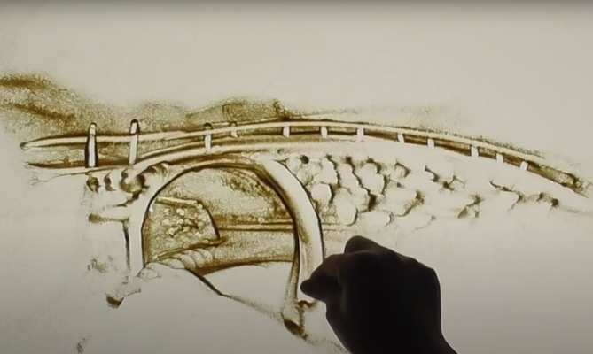 長崎県でのサンドアートパフォーマンスでは長崎のゆるキャラや観光地などを描きます。