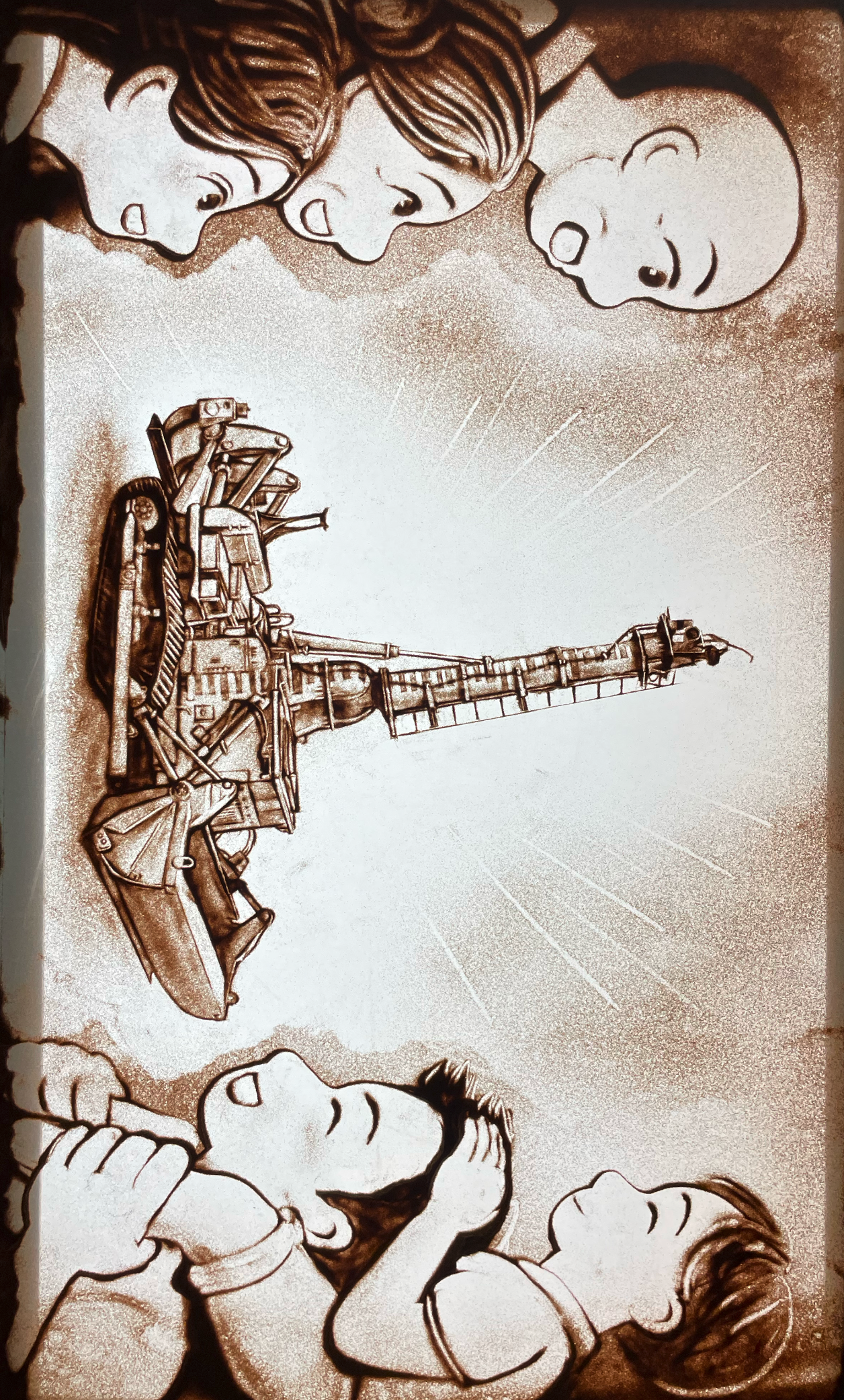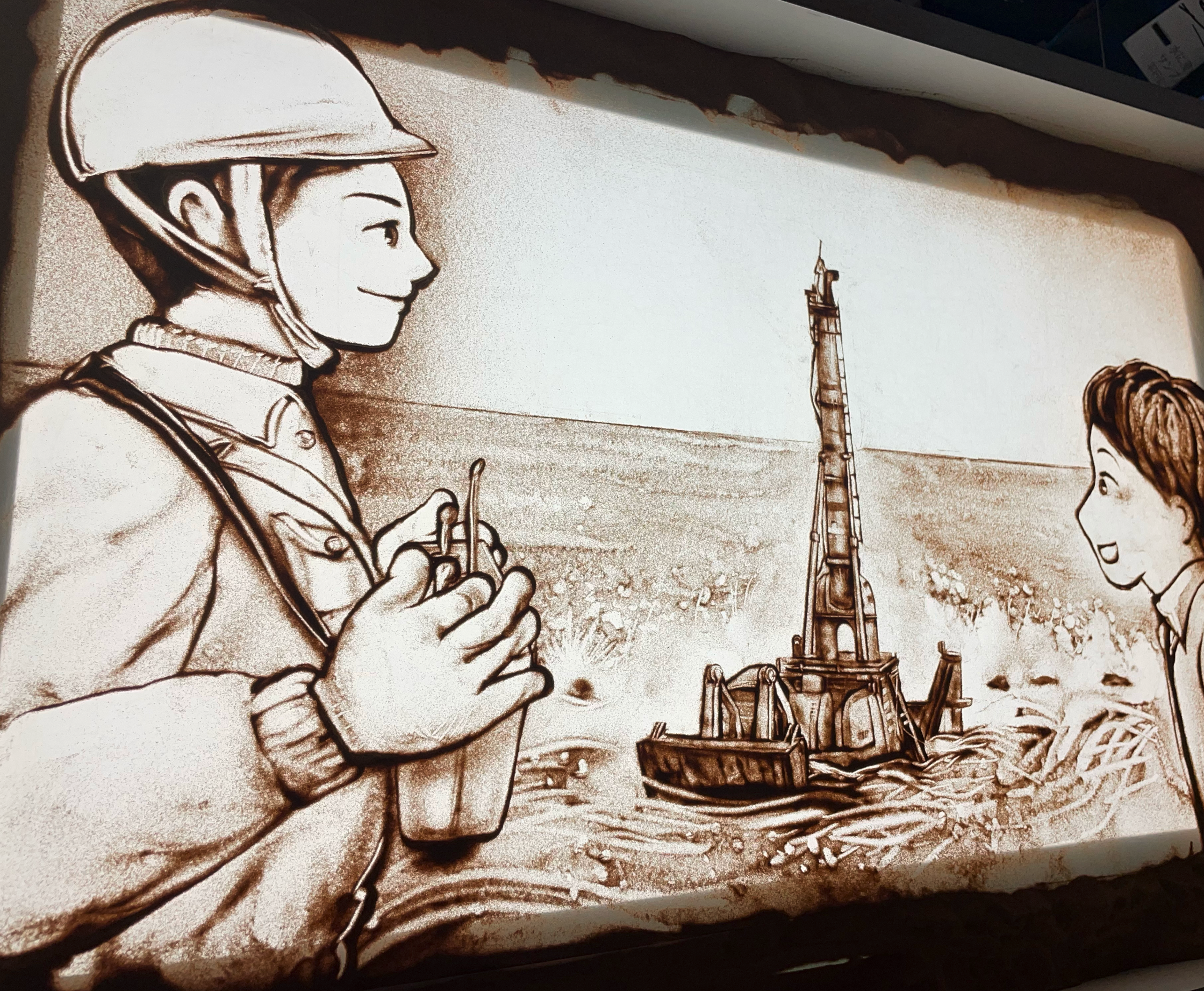 ⻘木あすなろ建設様とコマツ様の展示ブースで放送されている映像にKohei作画のサンドアートが使用されています。