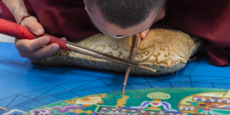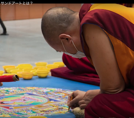 チベット仏教では瞑想を行いながら色砂で何週間もかけて曼荼羅を描くという修行が存在します。 土の上に金属のロートを使って着色した石の粉を少しずつ撒いて色鮮やかな絵図を描きます。その緻密で繊細な模様は仏の悟った境地や功徳を絵にしたもので、完成すると一定の手順に従って壊されます。使用した砂を川に流すまでが修行とされています。