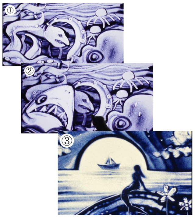 10分〜15分で6〜8枚くらい砂絵が展開し、描いた砂絵を完全に消さず次の砂絵に活かします。